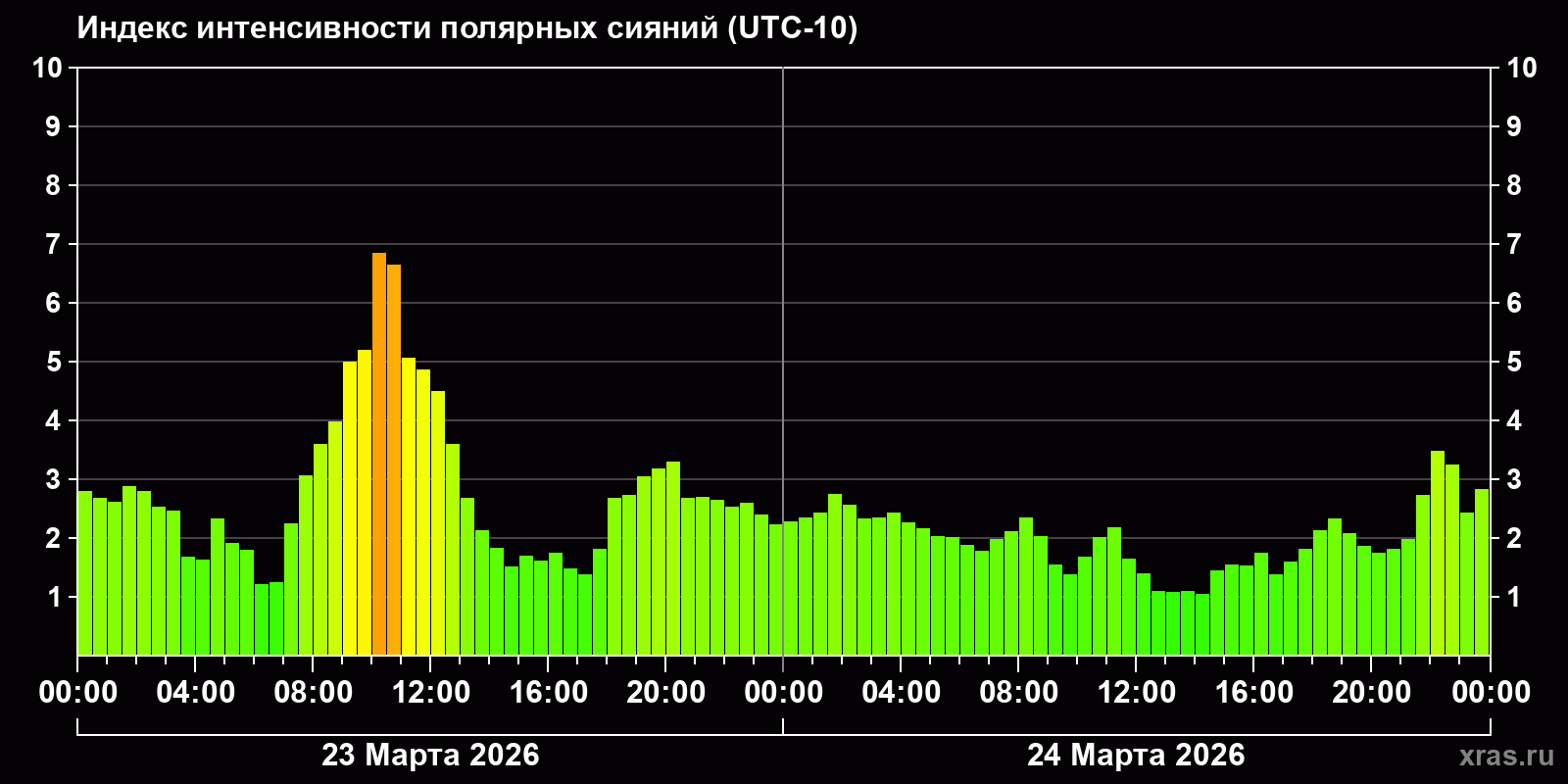 Изменения индекса интенсивности полярных сияний с 2026-03-23 по 2026-03-24 по местному времени