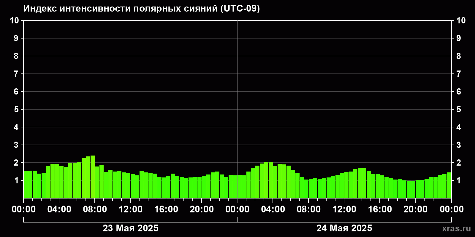 Изменения индекса интенсивности полярных сияний с 2025-05-23 по 2025-05-24 по местному времени