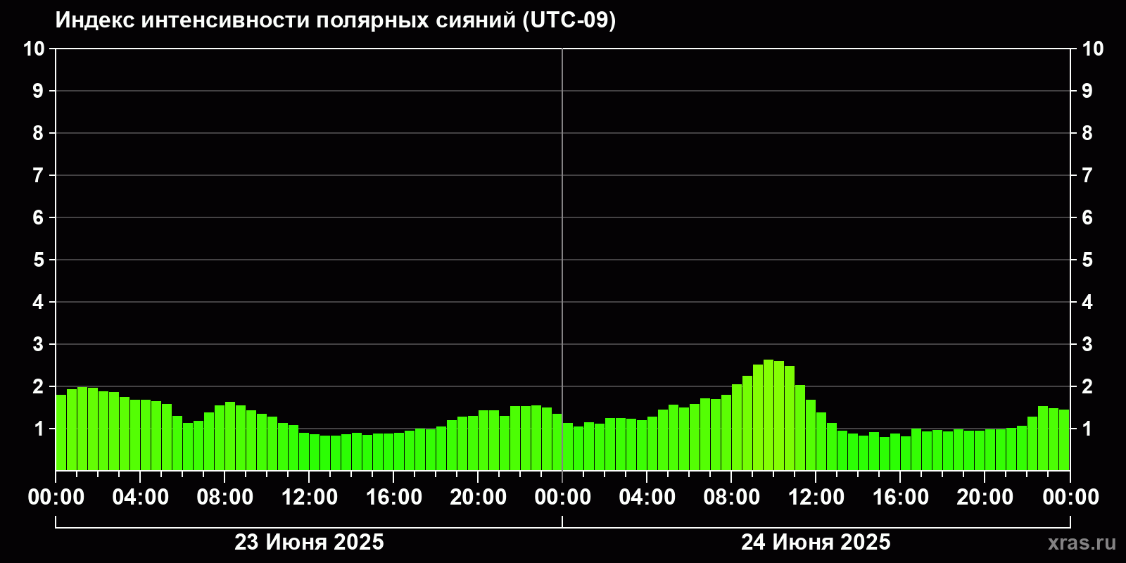 Изменения индекса интенсивности полярных сияний с 2025-06-23 по 2025-06-24 по местному времени
