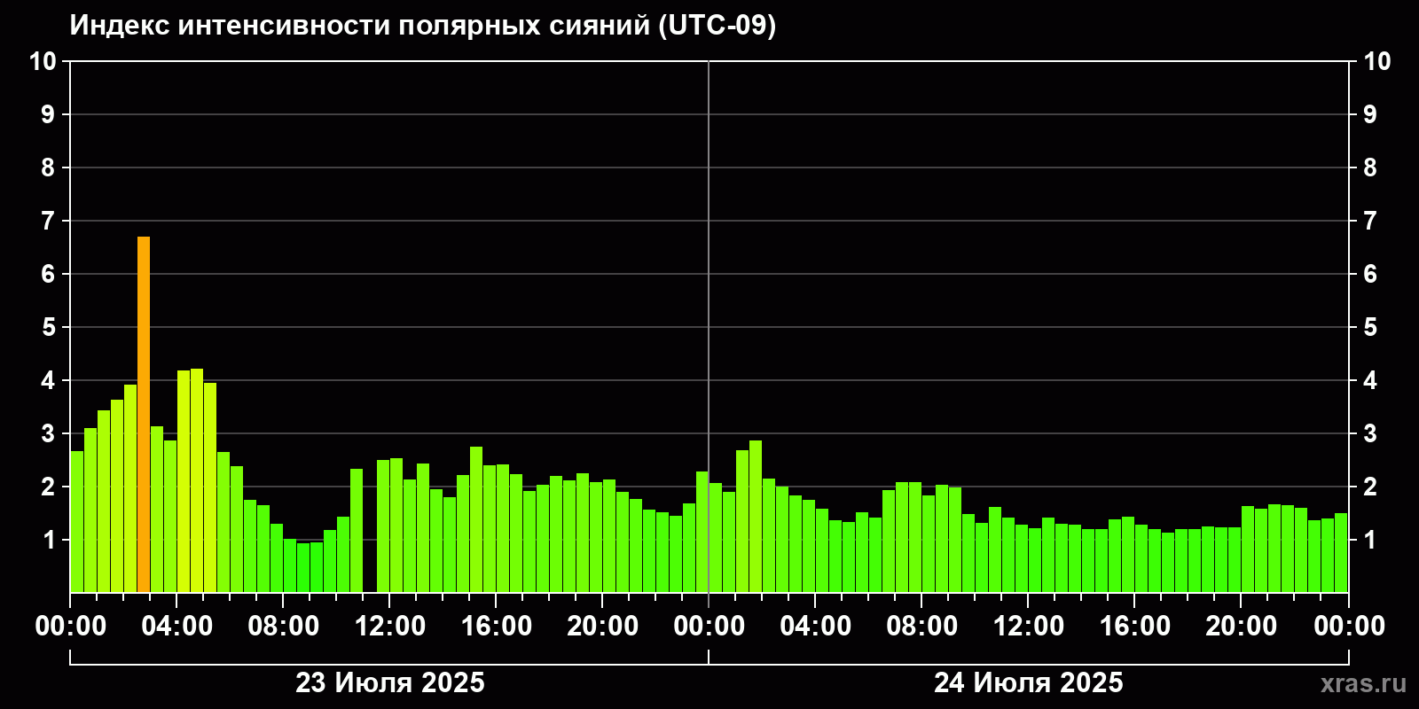 Изменения индекса интенсивности полярных сияний с 2025-07-23 по 2025-07-24 по местному времени