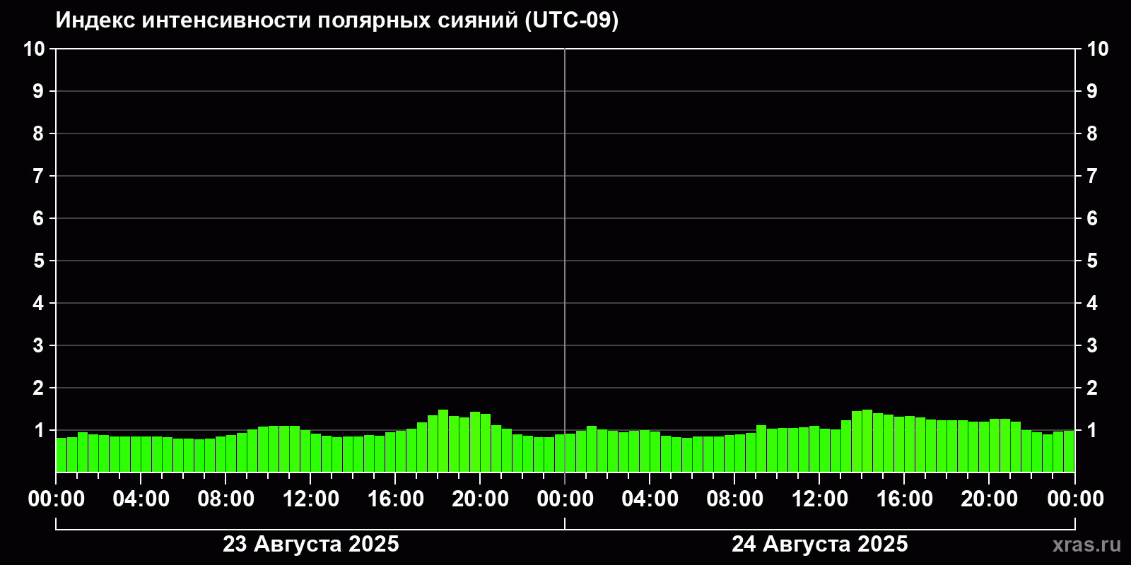 Изменения индекса интенсивности полярных сияний с 2025-08-23 по 2025-08-24 по местному времени