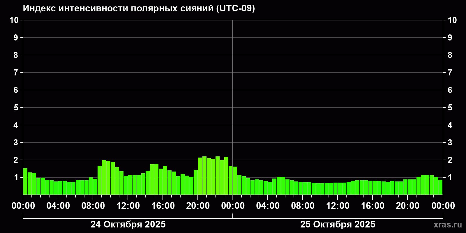Изменения индекса интенсивности полярных сияний с 2025-10-24 по 2025-10-25 по местному времени