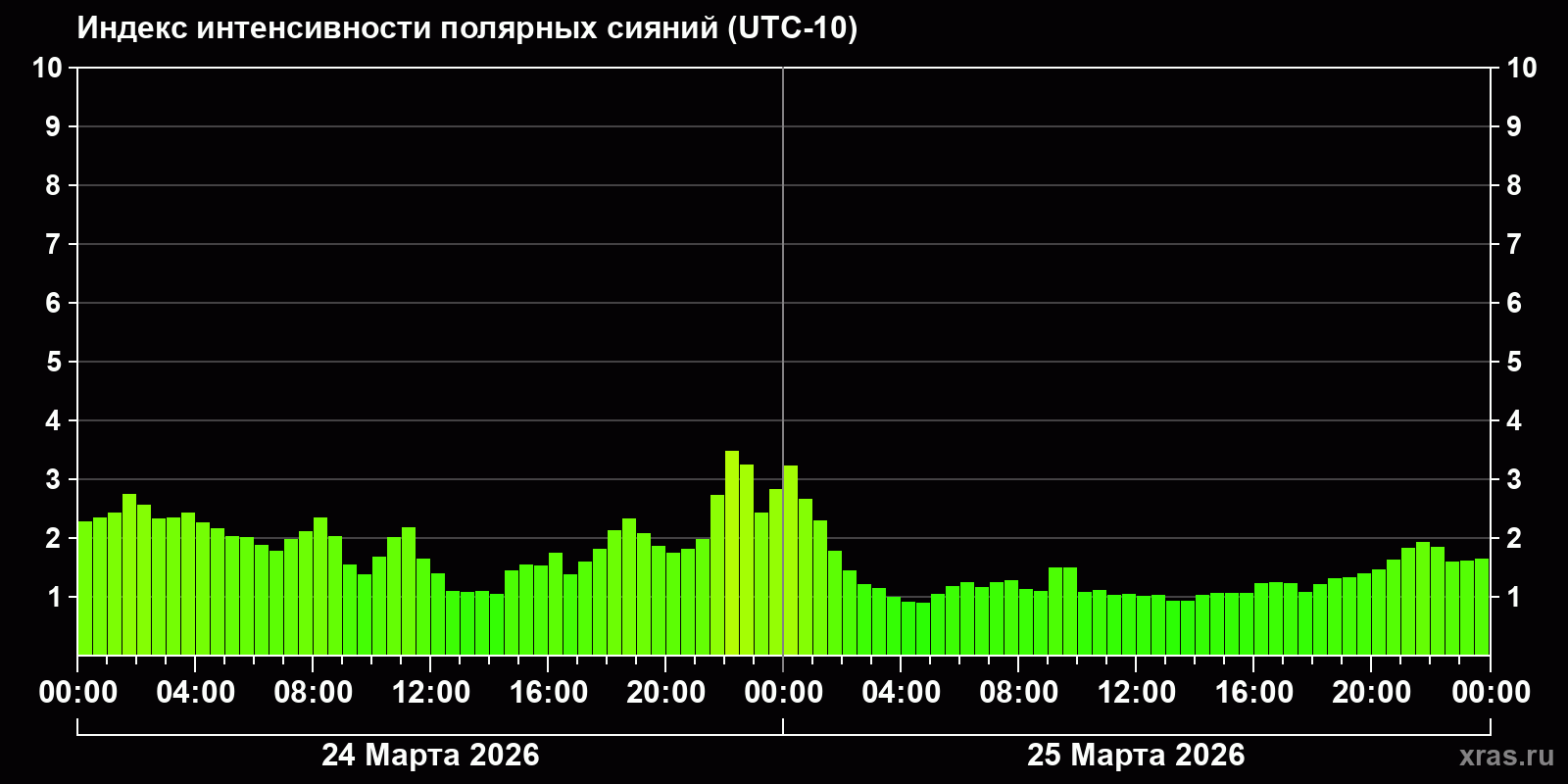 Изменения индекса интенсивности полярных сияний с 2026-03-24 по 2026-03-25 по местному времени