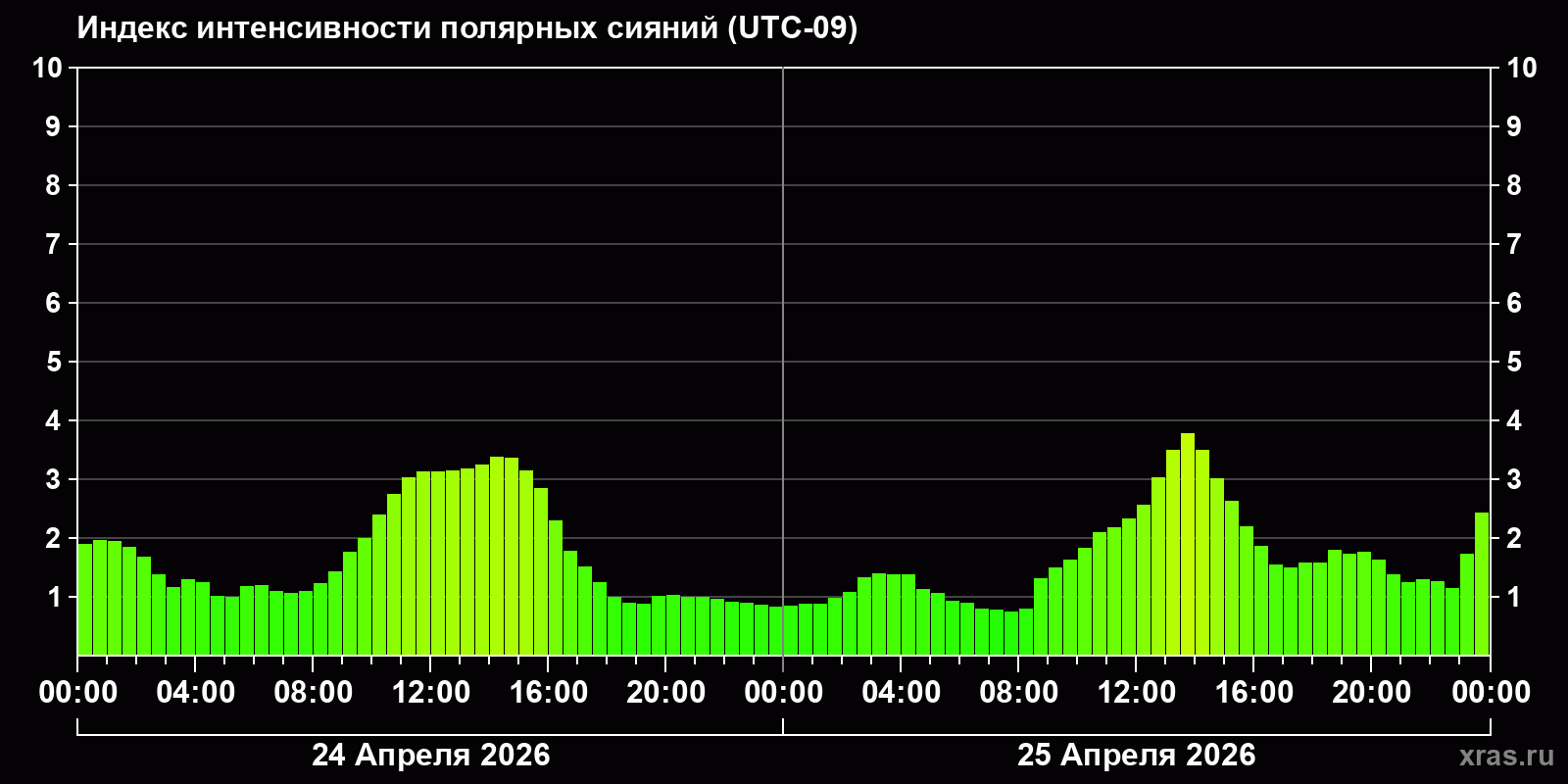 Изменения индекса интенсивности полярных сияний с 2026-04-24 по 2026-04-25 по местному времени