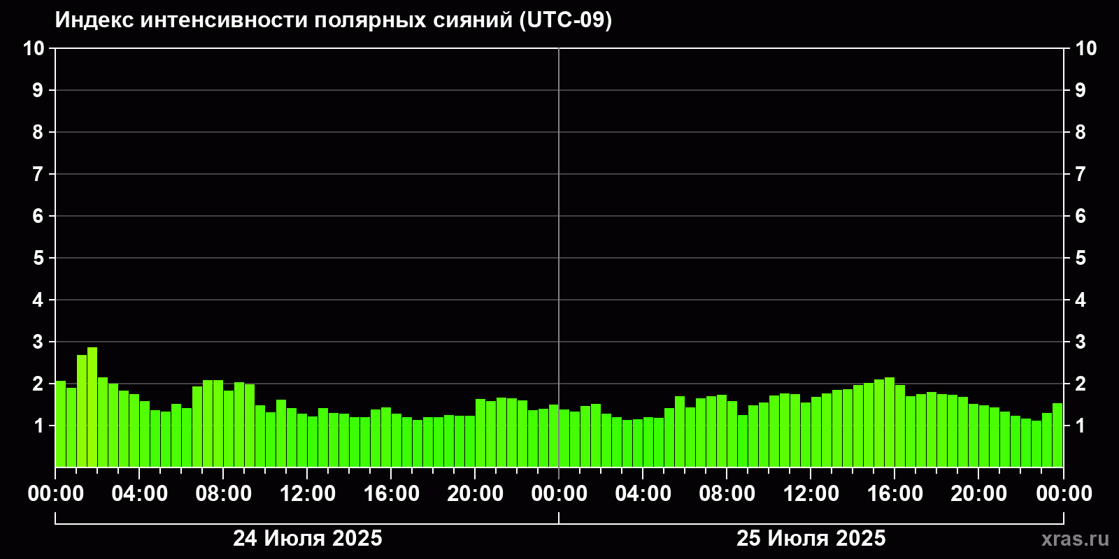 Изменения индекса интенсивности полярных сияний с 2025-07-24 по 2025-07-25 по местному времени