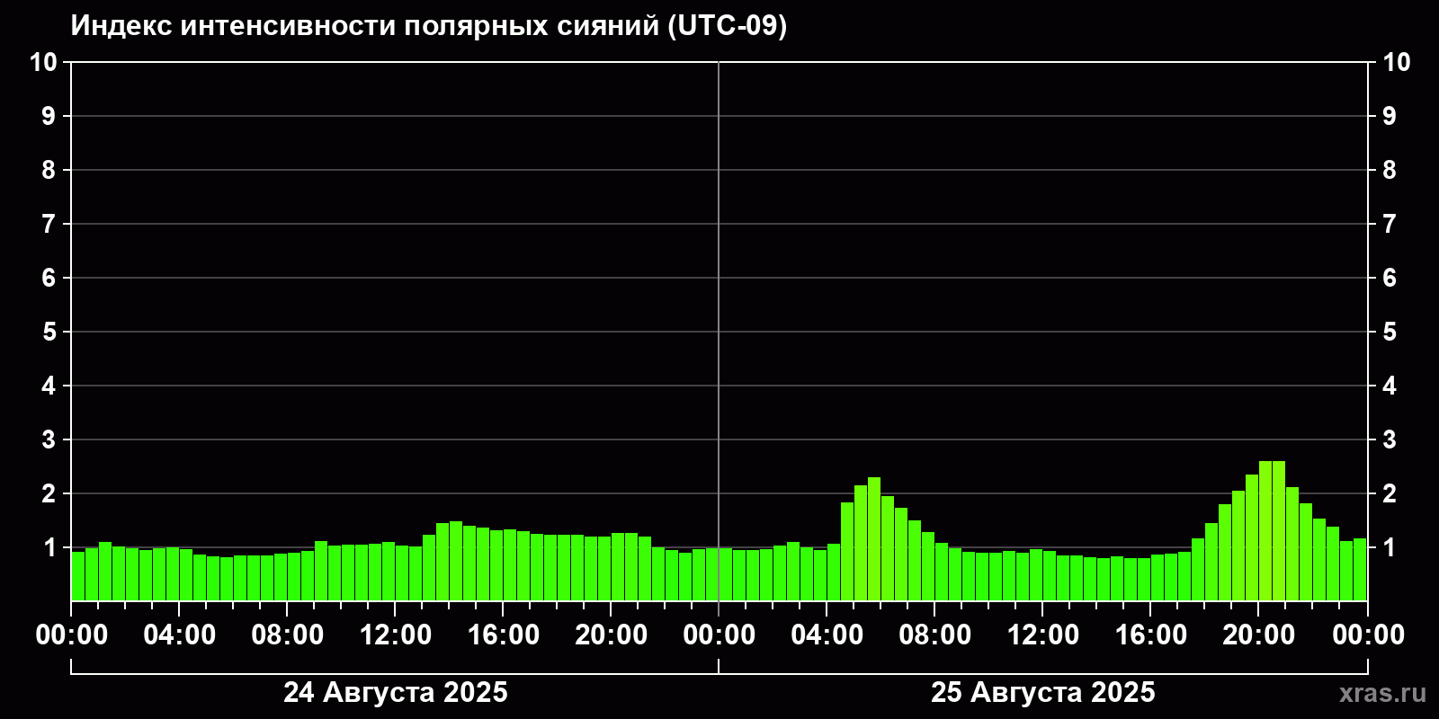 Изменения индекса интенсивности полярных сияний с 2025-08-24 по 2025-08-25 по местному времени