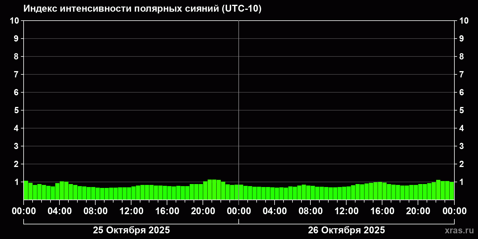 Изменения индекса интенсивности полярных сияний с 2025-10-25 по 2025-10-26 по местному времени