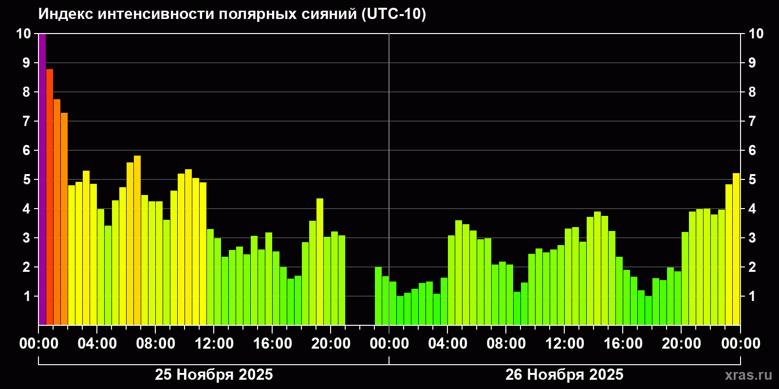 Изменения индекса интенсивности полярных сияний с 2025-11-25 по 2025-11-26 по местному времени