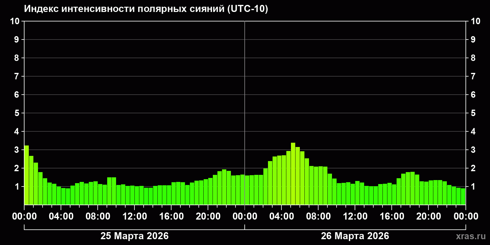 Изменения индекса интенсивности полярных сияний с 2026-03-25 по 2026-03-26 по местному времени