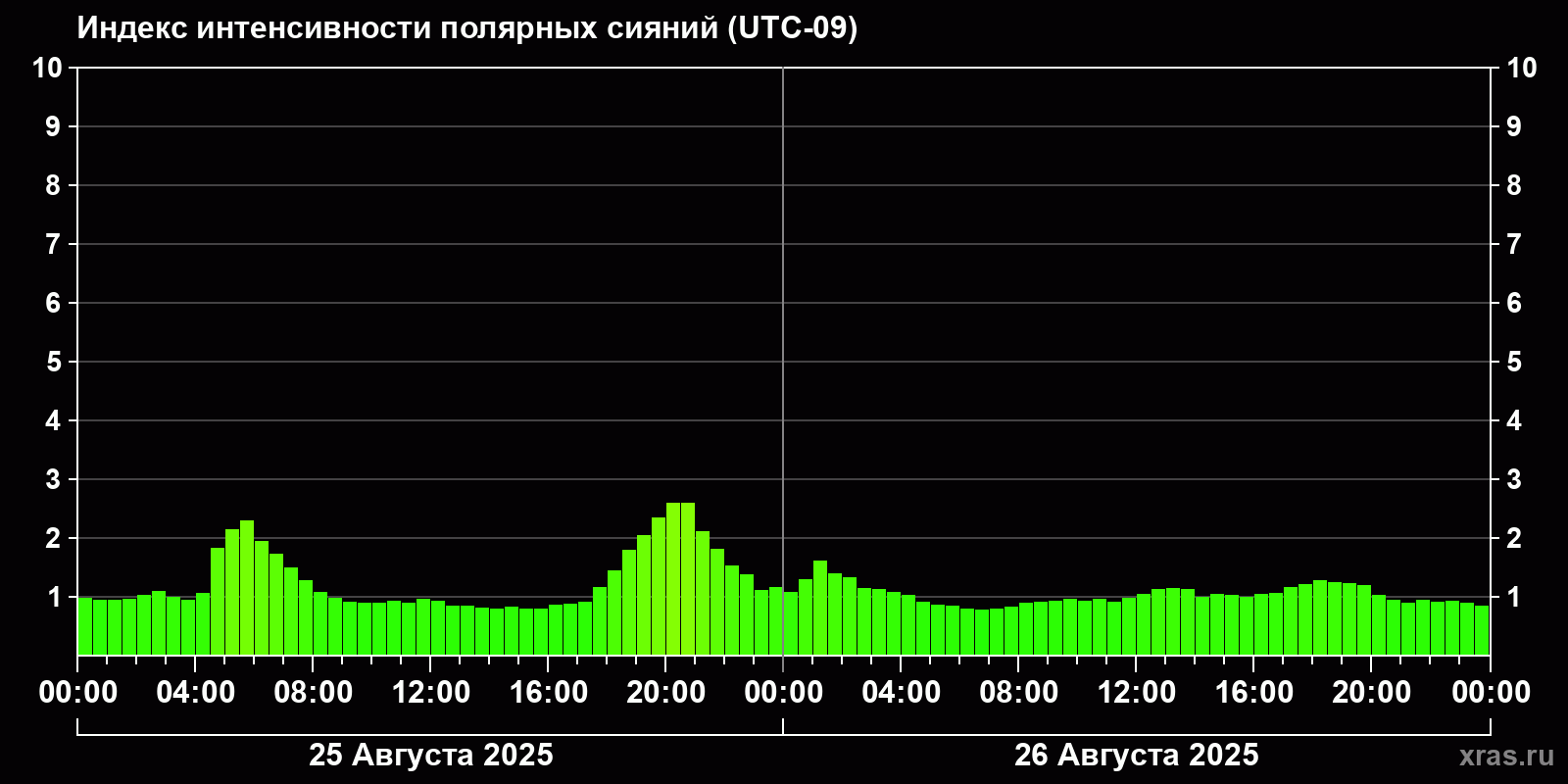 Изменения индекса интенсивности полярных сияний с 2025-08-25 по 2025-08-26 по местному времени