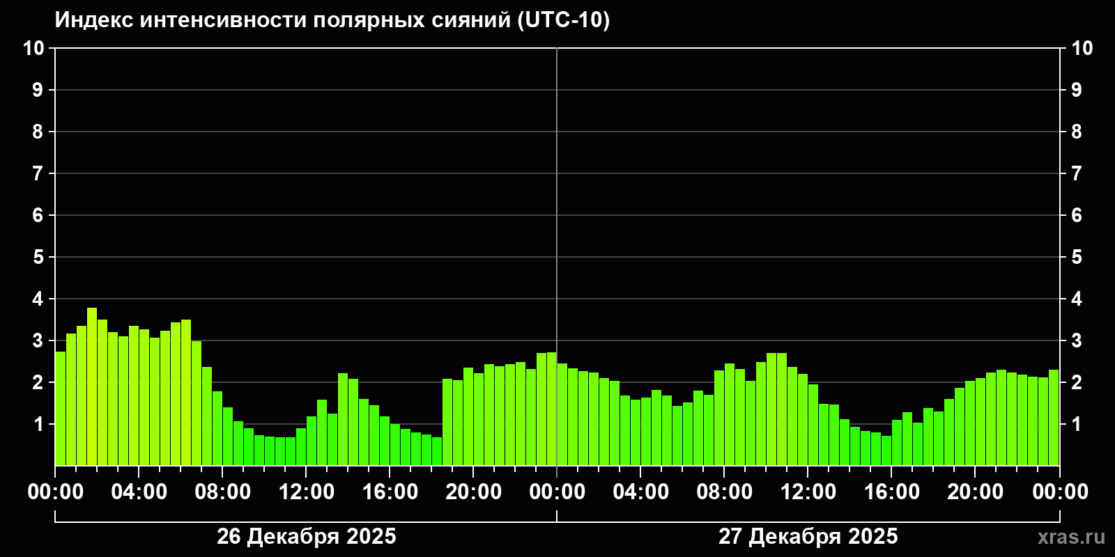 Изменения индекса интенсивности полярных сияний с 2025-12-26 по 2025-12-27 по местному времени