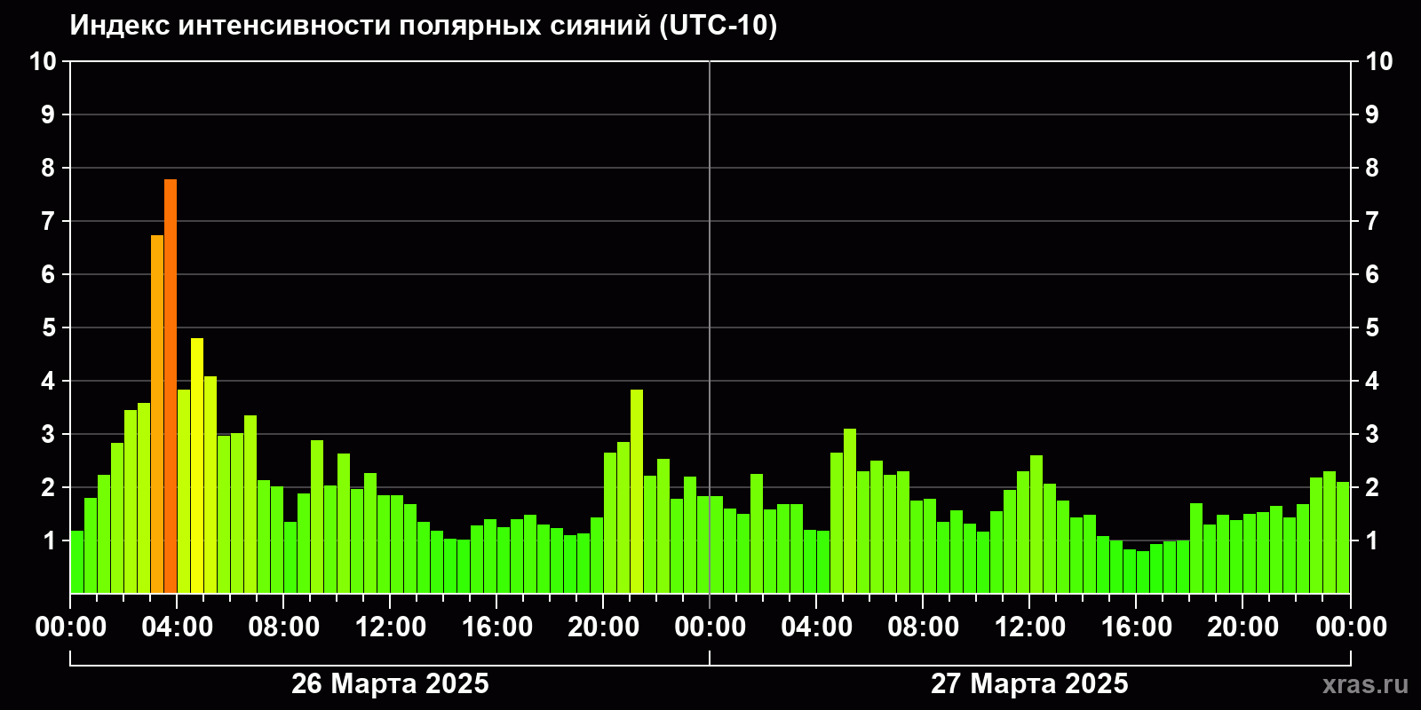 Изменения индекса интенсивности полярных сияний с 2025-03-26 по 2025-03-27 по местному времени
