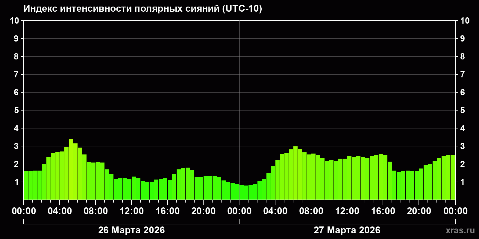 Изменения индекса интенсивности полярных сияний с 2026-03-26 по 2026-03-27 по местному времени