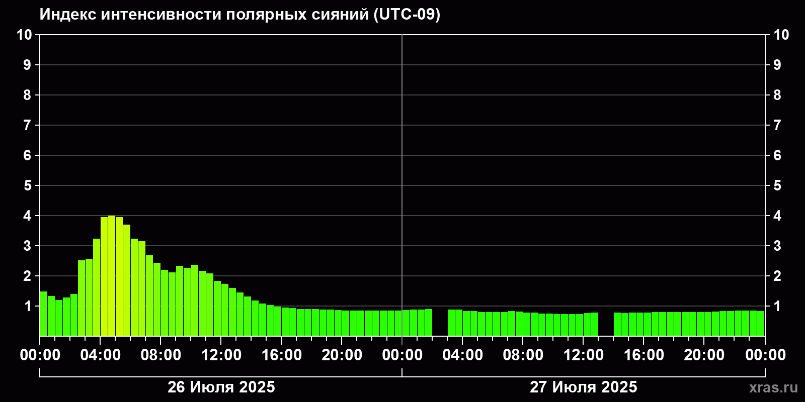 Изменения индекса интенсивности полярных сияний с 2025-07-26 по 2025-07-27 по местному времени