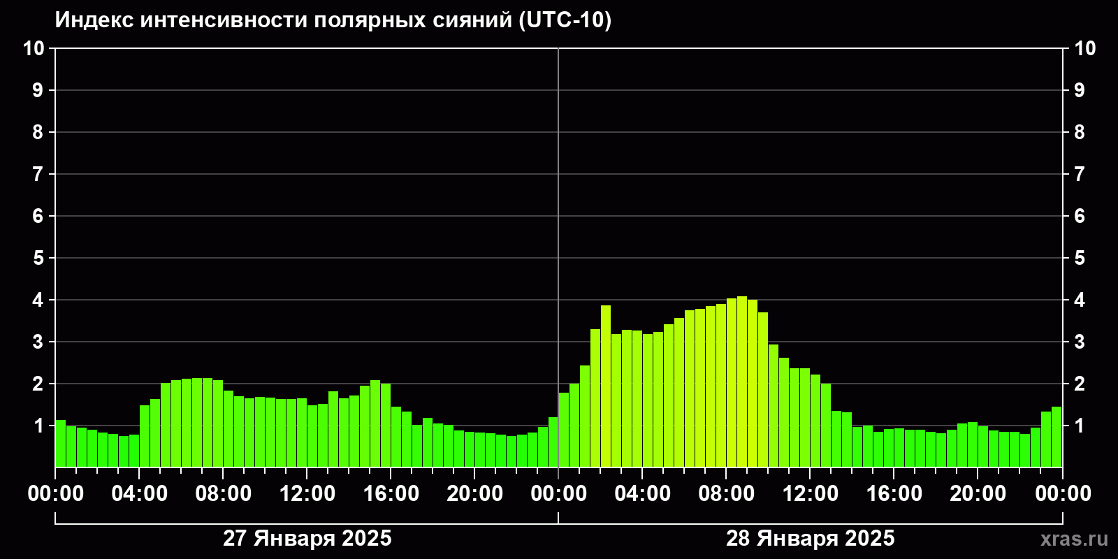 Изменения индекса интенсивности полярных сияний с 2025-01-27 по 2025-01-28 по местному времени