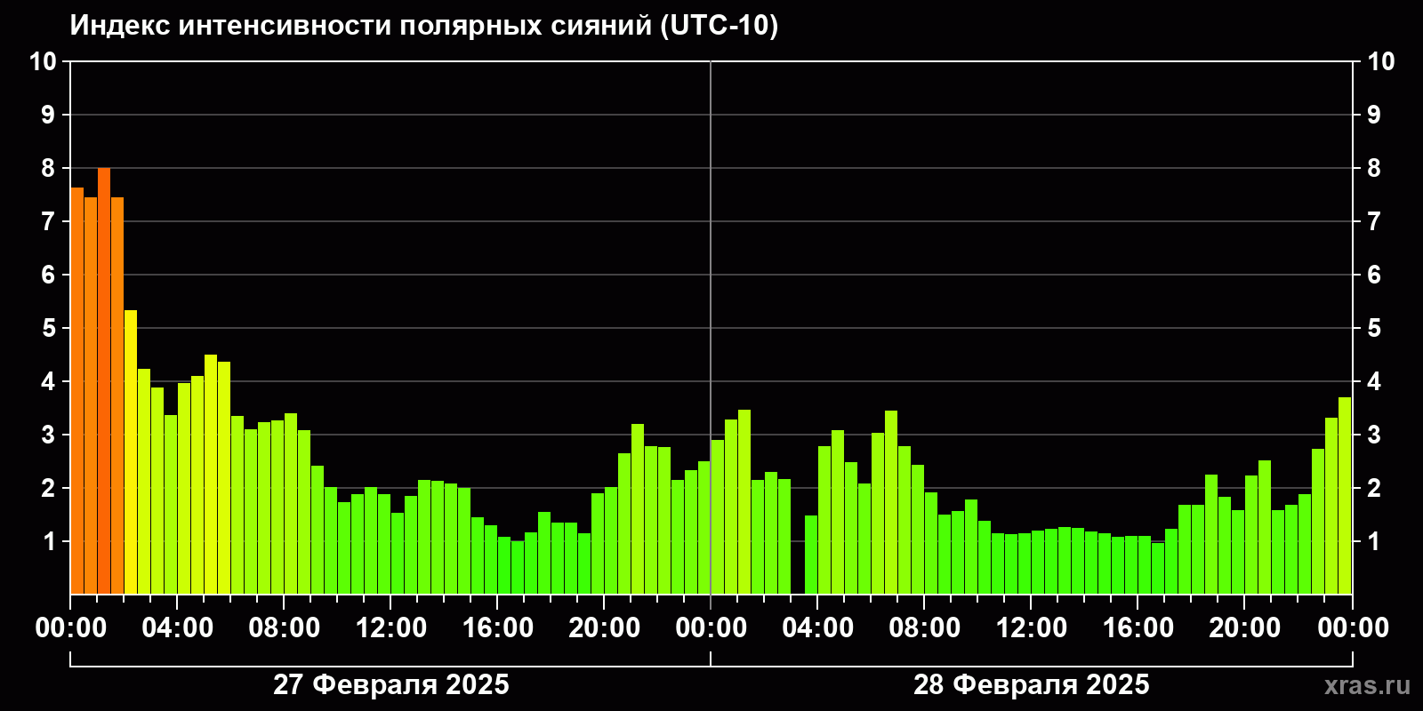 Изменения индекса интенсивности полярных сияний с 2025-02-27 по 2025-02-28 по местному времени