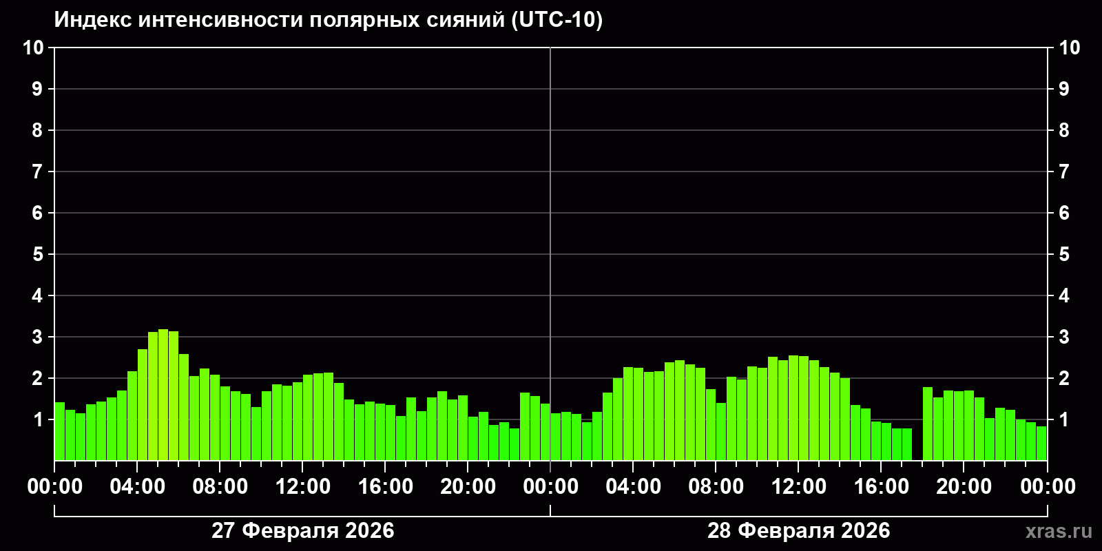 Изменения индекса интенсивности полярных сияний с 2026-02-27 по 2026-02-28 по местному времени