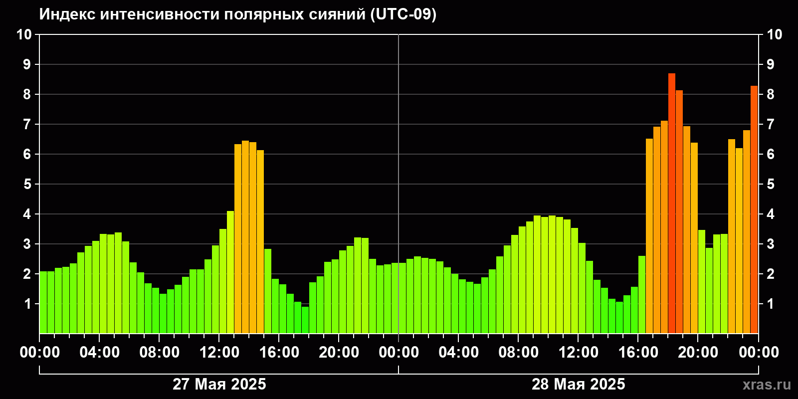 Изменения индекса интенсивности полярных сияний с 2025-05-27 по 2025-05-28 по местному времени