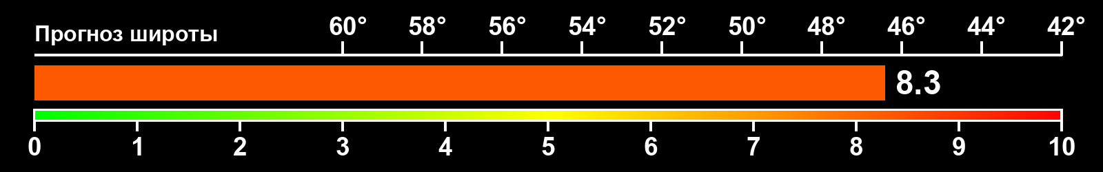 Индекс интенсивности полярных сияний и теоретически возможная широта наблюдений для ночного времени в западном полушарии по состоянию на 2025-05-28 23:48 (конец дня) по местному времени