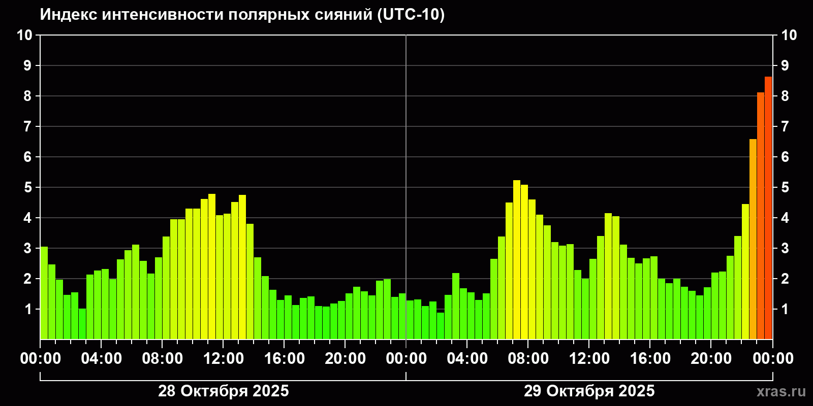 Изменения индекса интенсивности полярных сияний с 2025-10-28 по 2025-10-29 по местному времени