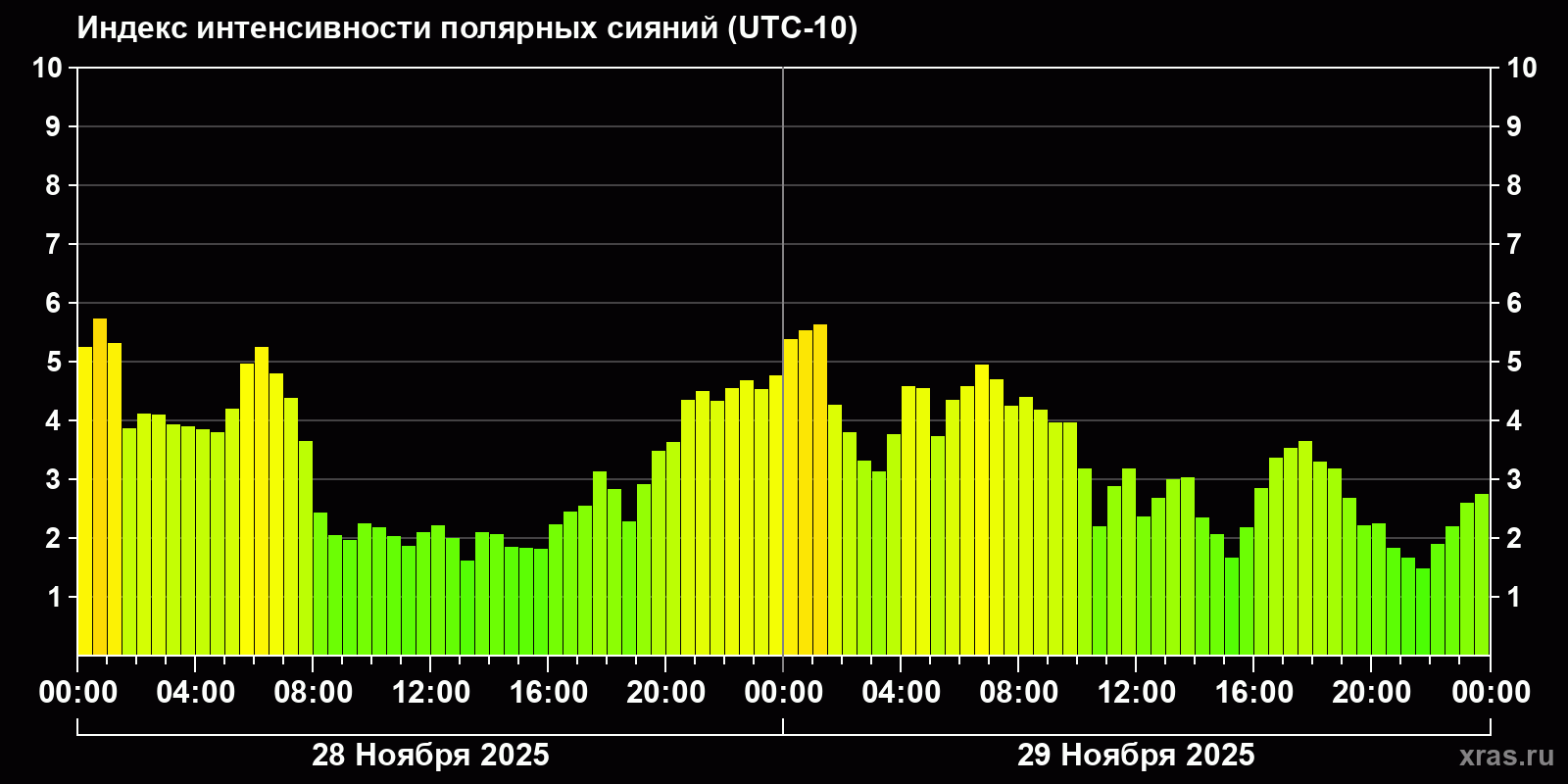Изменения индекса интенсивности полярных сияний с 2025-11-28 по 2025-11-29 по местному времени