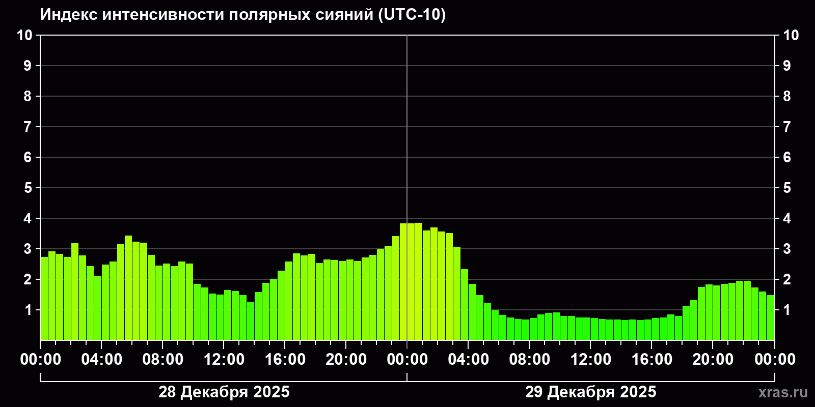 Изменения индекса интенсивности полярных сияний с 2025-12-28 по 2025-12-29 по местному времени