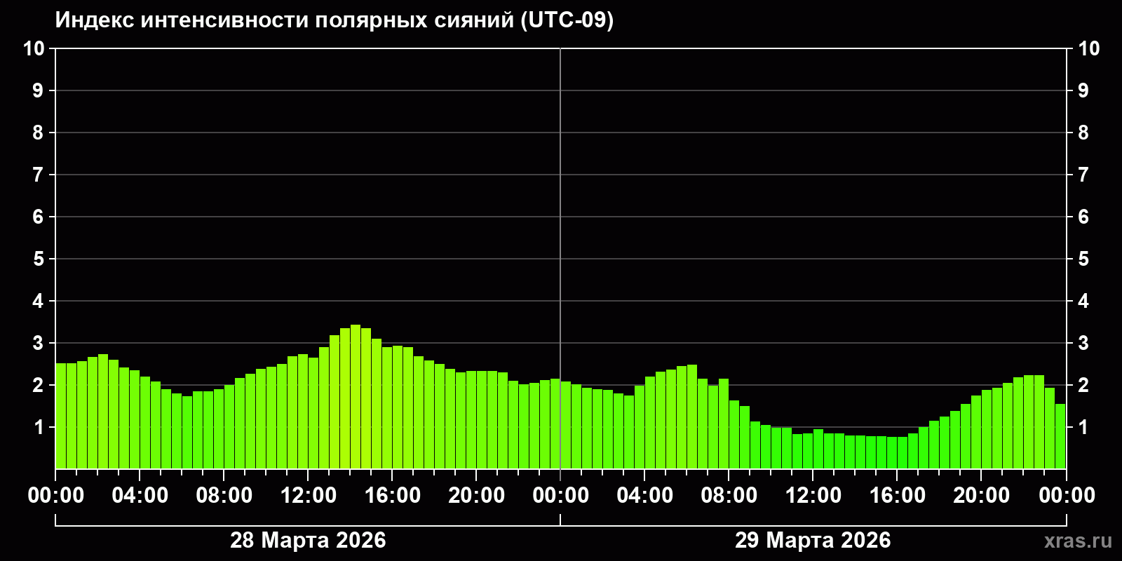 Изменения индекса интенсивности полярных сияний с 2026-03-28 по 2026-03-29 по местному времени
