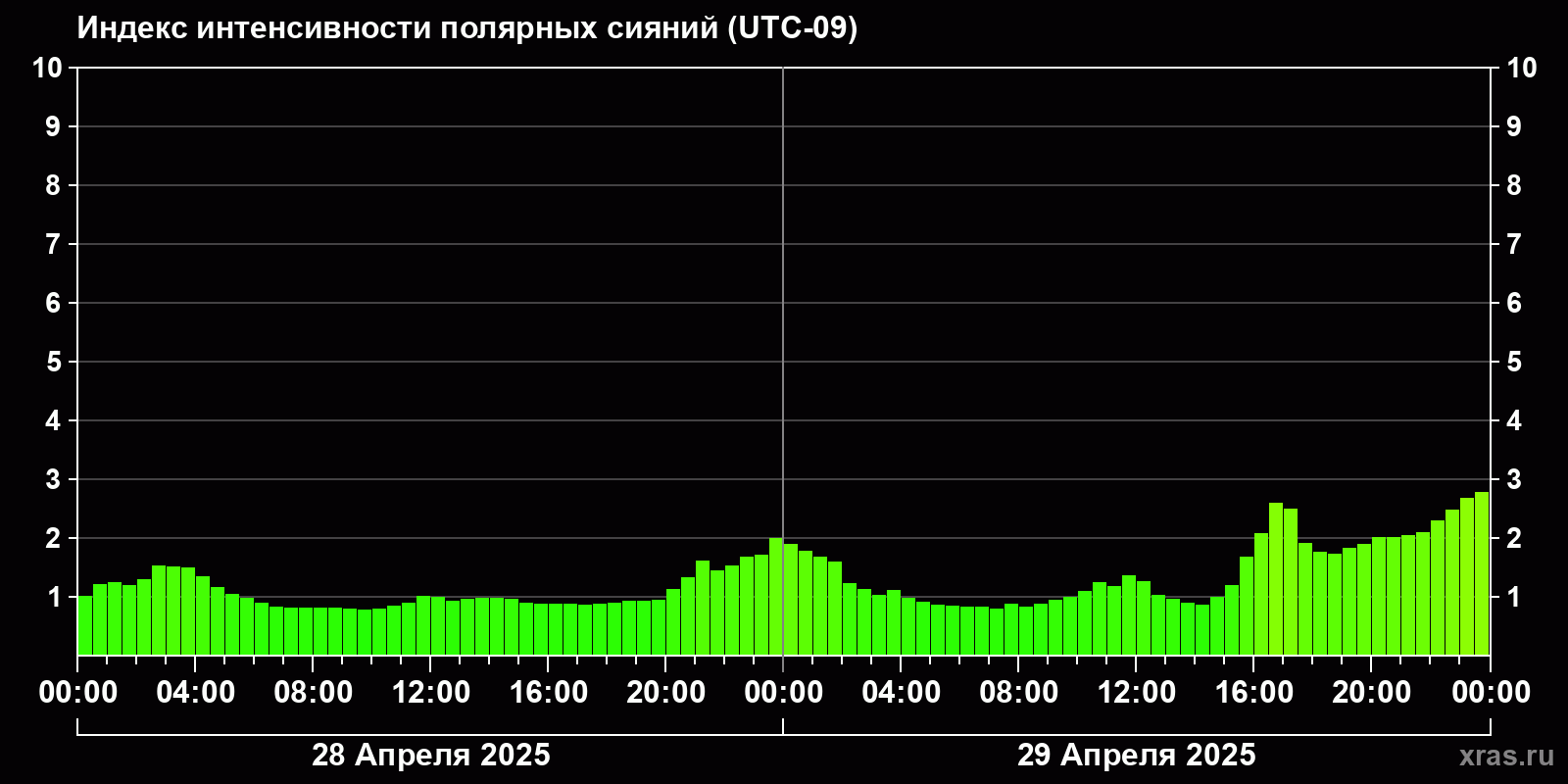 Изменения индекса интенсивности полярных сияний с 2025-04-28 по 2025-04-29 по местному времени