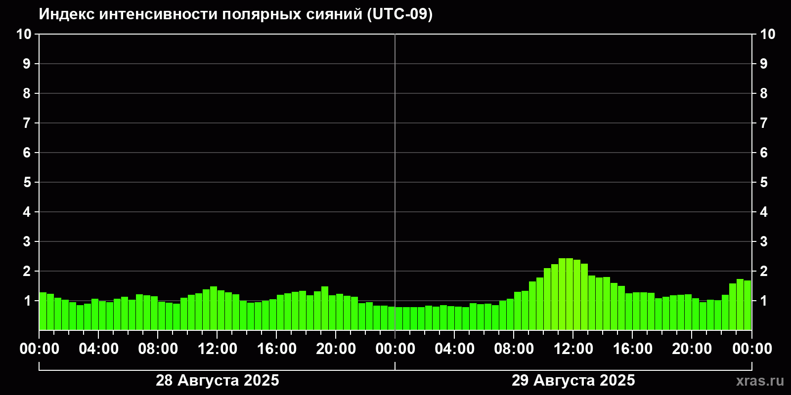 Изменения индекса интенсивности полярных сияний с 2025-08-28 по 2025-08-29 по местному времени
