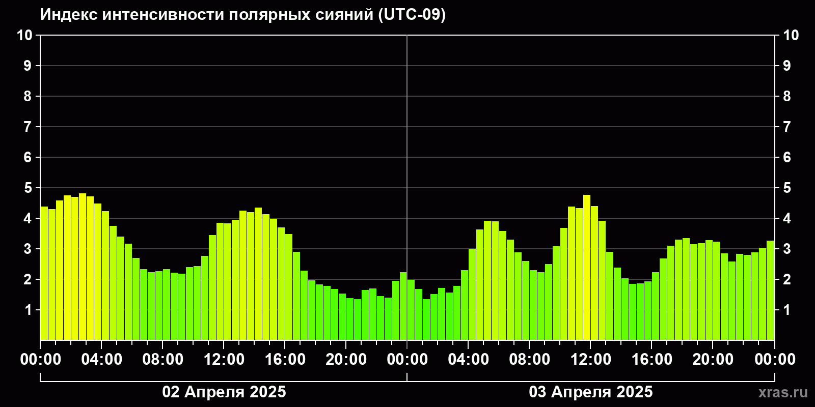 Изменения индекса интенсивности полярных сияний с 2025-04-02 по 2025-04-03 по местному времени