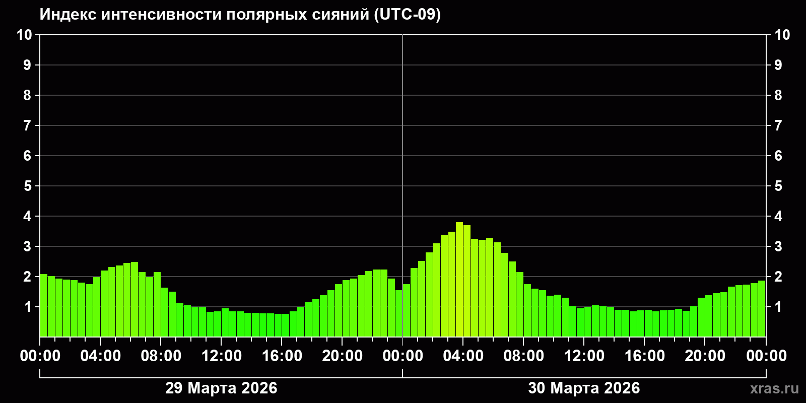 Изменения индекса интенсивности полярных сияний с 2026-03-29 по 2026-03-30 по местному времени