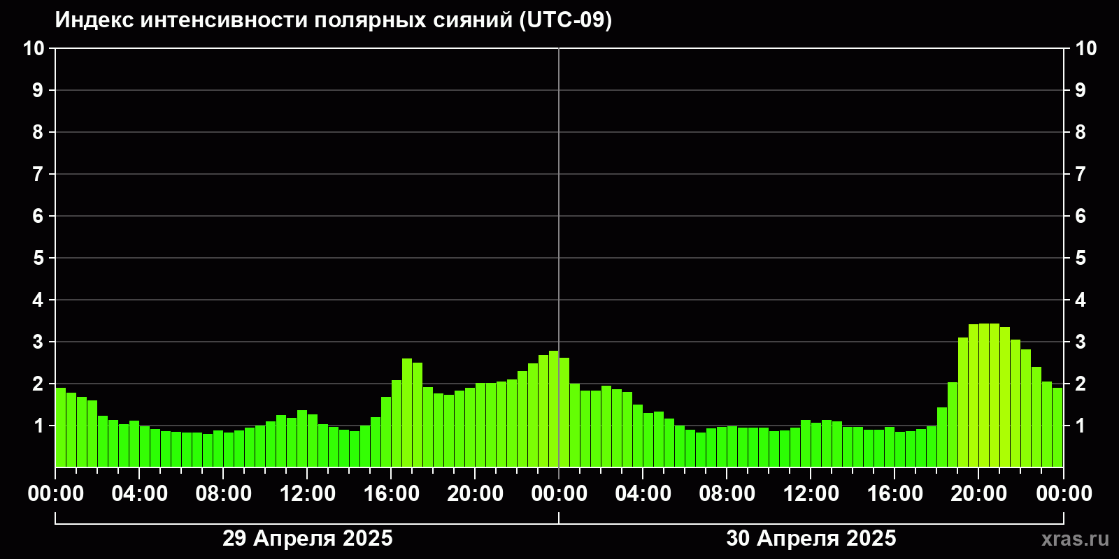 Изменения индекса интенсивности полярных сияний с 2025-04-29 по 2025-04-30 по местному времени