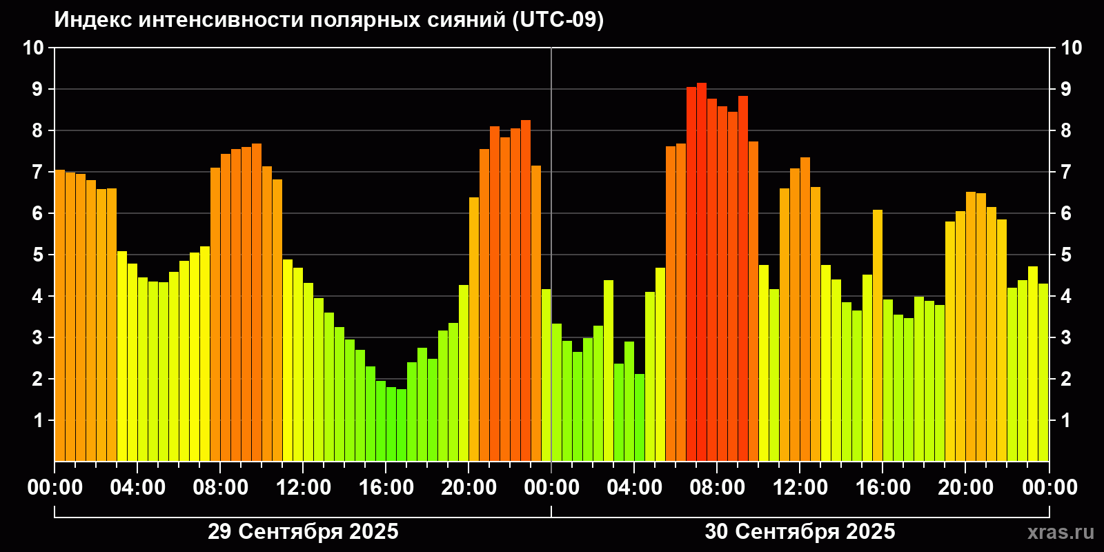 Изменения индекса интенсивности полярных сияний с 2025-09-29 по 2025-09-30 по местному времени