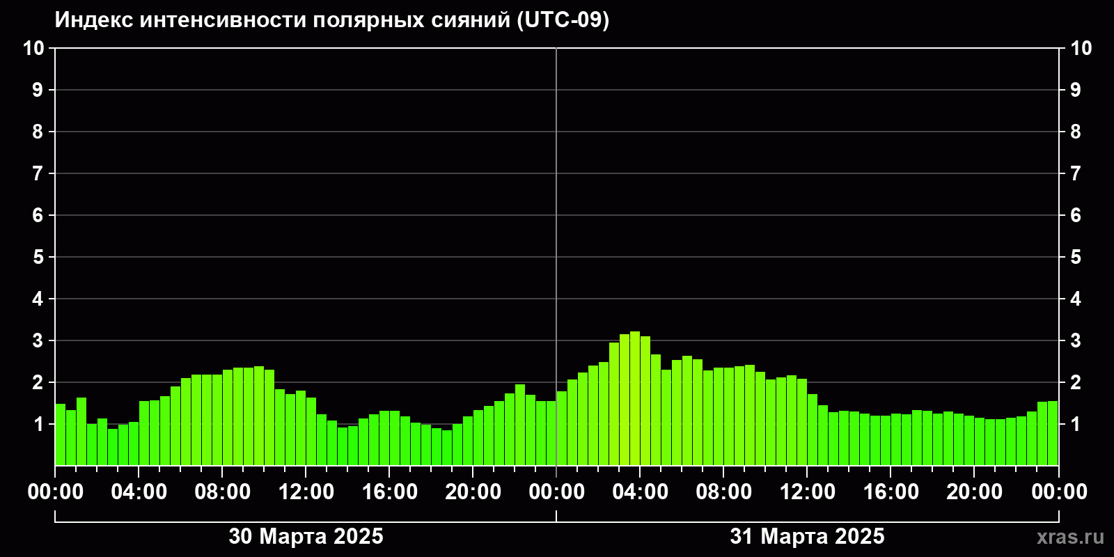 Изменения индекса интенсивности полярных сияний с 2025-03-30 по 2025-03-31 по местному времени
