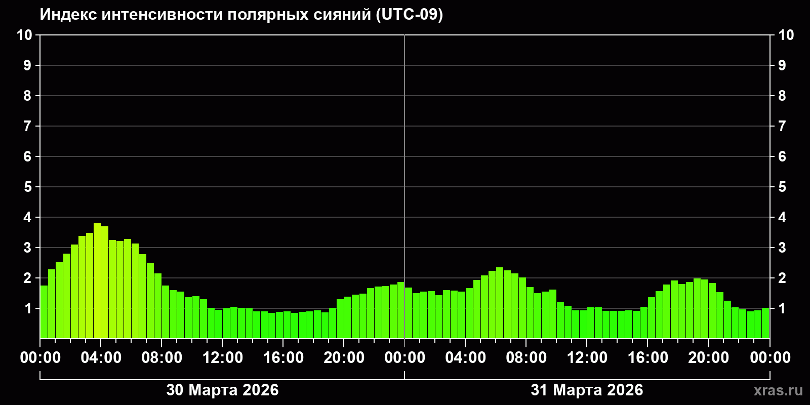 Изменения индекса интенсивности полярных сияний с 2026-03-30 по 2026-03-31 по местному времени
