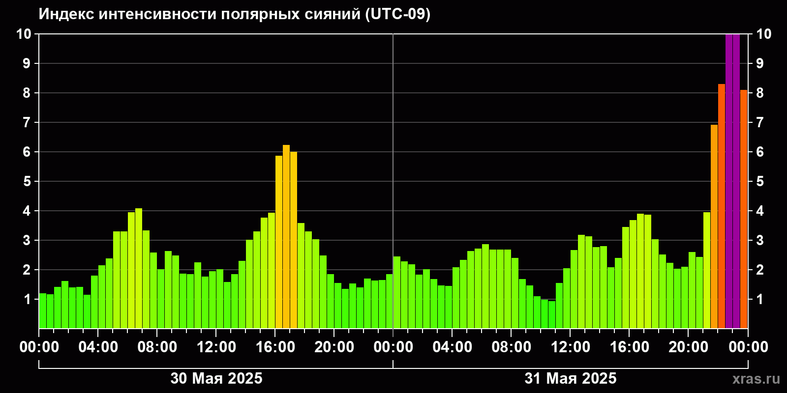 Изменения индекса интенсивности полярных сияний с 2025-05-30 по 2025-05-31 по местному времени