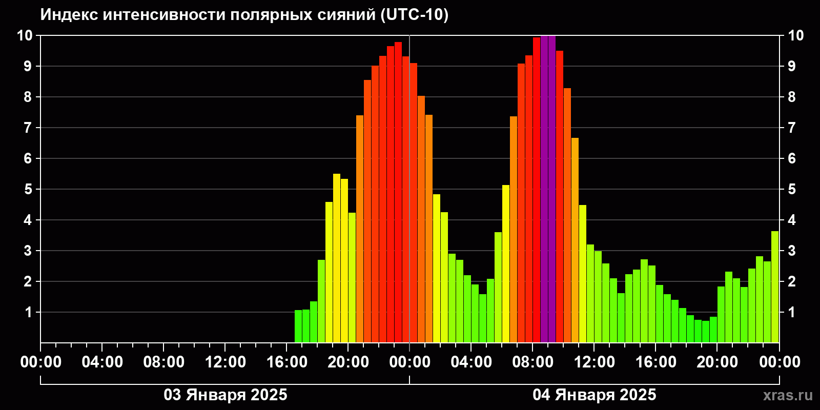 Изменения индекса интенсивности полярных сияний с 2025-01-03 по 2025-01-04 по местному времени