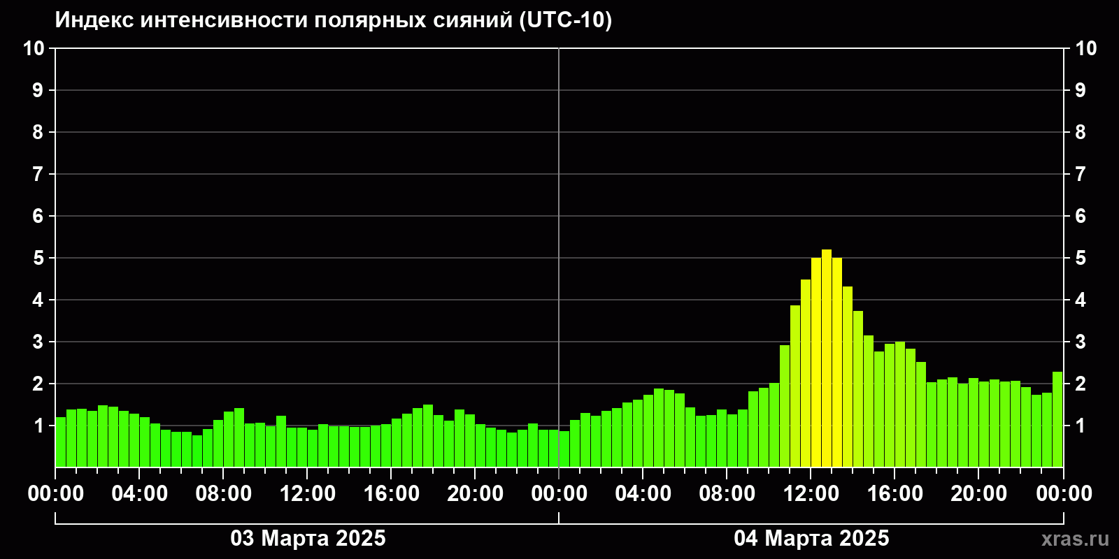 Изменения индекса интенсивности полярных сияний с 2025-03-03 по 2025-03-04 по местному времени