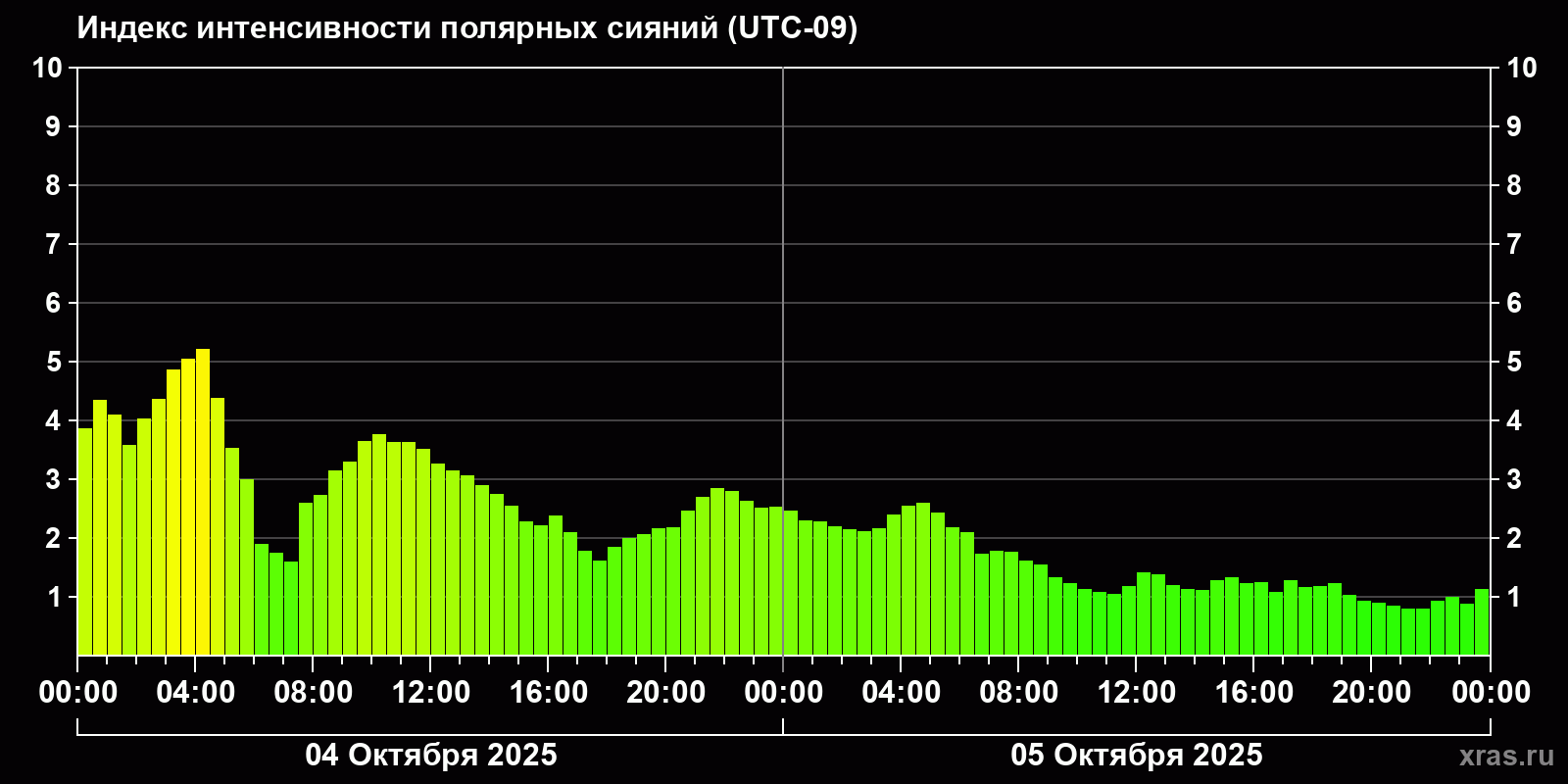 Изменения индекса интенсивности полярных сияний с 2025-10-04 по 2025-10-05 по местному времени