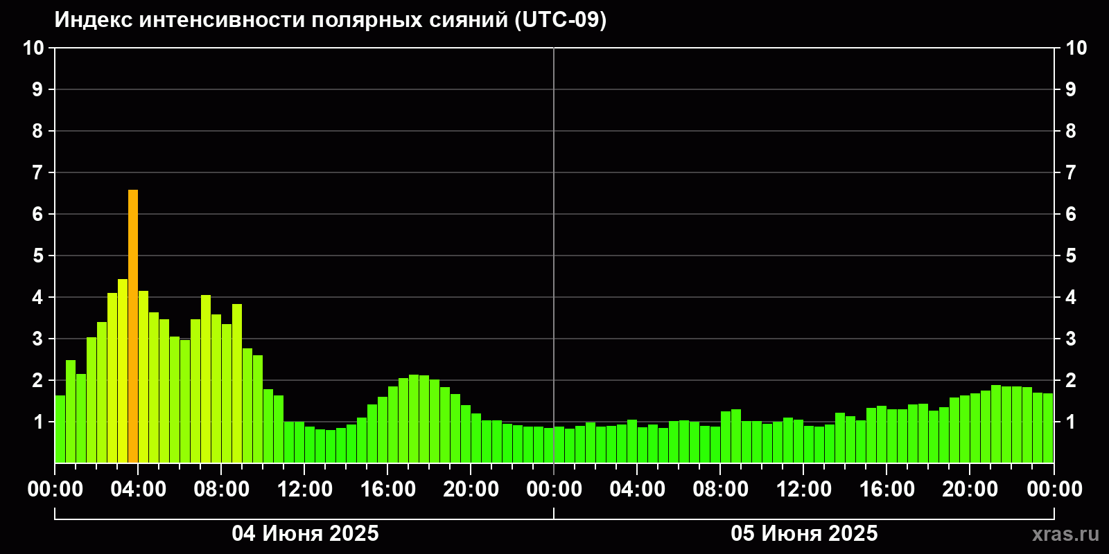 Изменения индекса интенсивности полярных сияний с 2025-06-04 по 2025-06-05 по местному времени