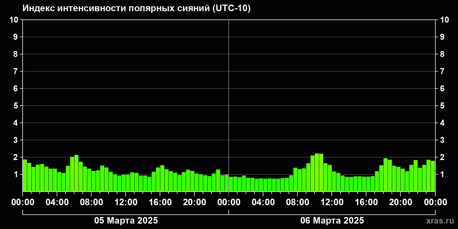 Изменения индекса интенсивности полярных сияний с 2025-03-05 по 2025-03-06 по местному времени