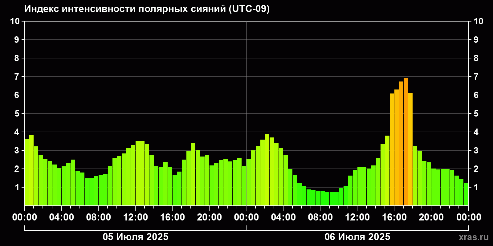 Изменения индекса интенсивности полярных сияний с 2025-07-05 по 2025-07-06 по местному времени