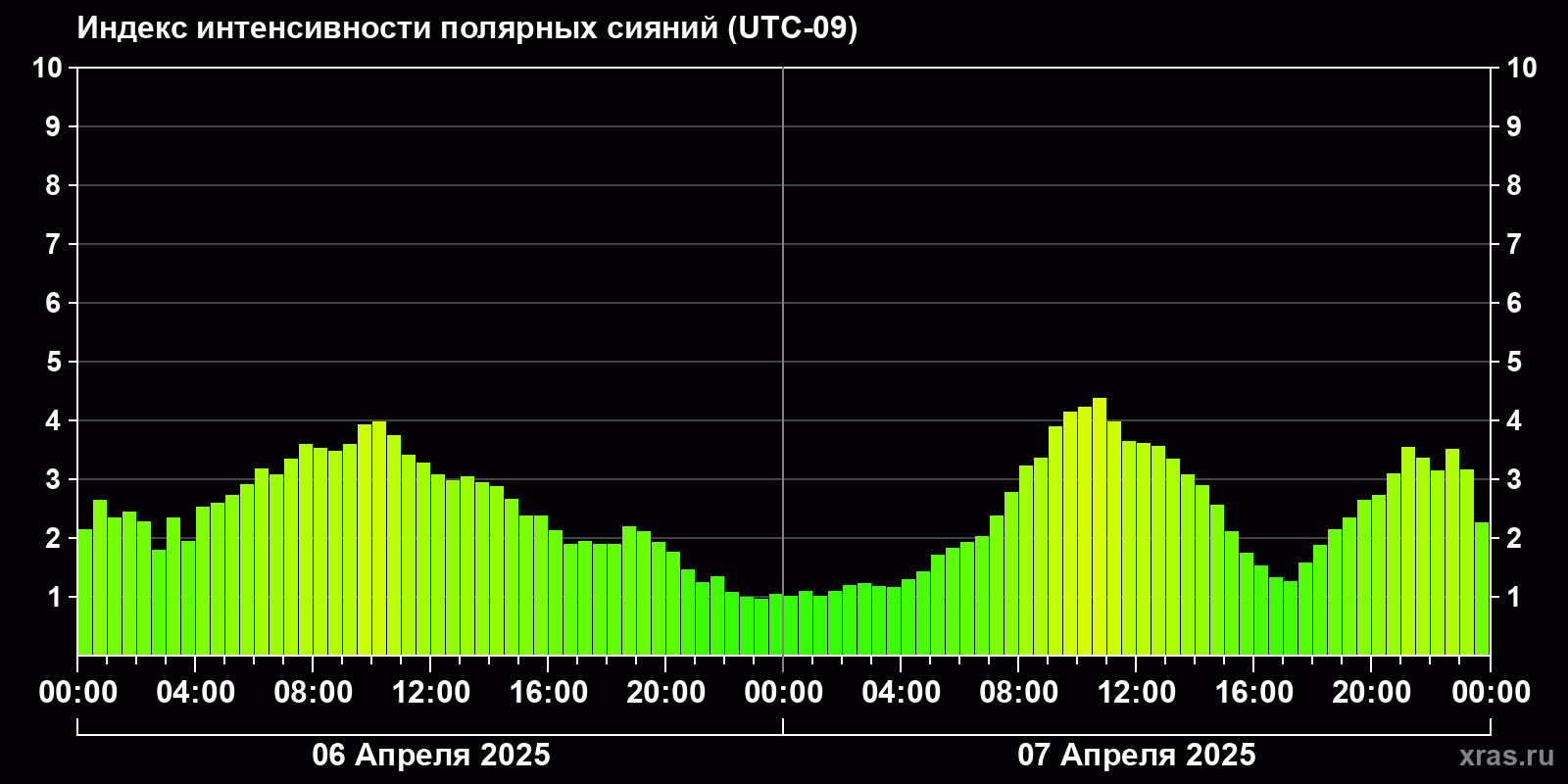 Изменения индекса интенсивности полярных сияний с 2025-04-06 по 2025-04-07 по местному времени