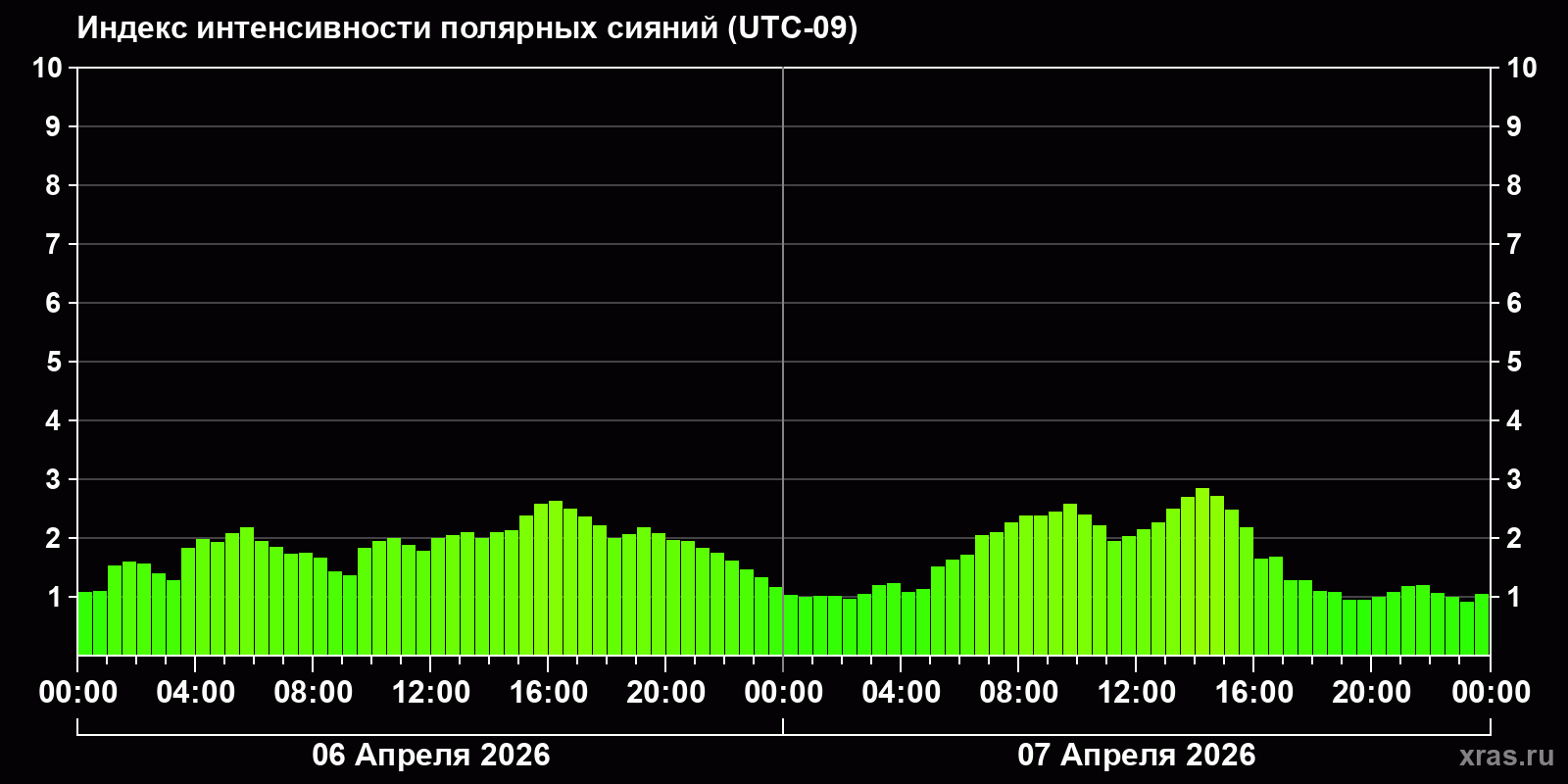 Изменения индекса интенсивности полярных сияний с 2026-04-06 по 2026-04-07 по местному времени