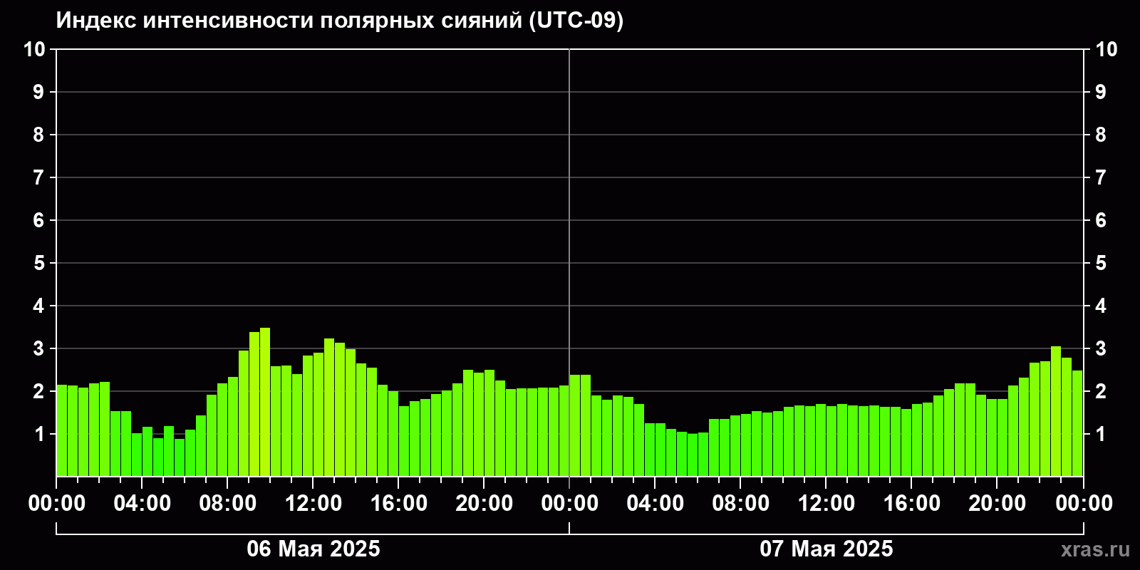 Изменения индекса интенсивности полярных сияний с 2025-05-06 по 2025-05-07 по местному времени