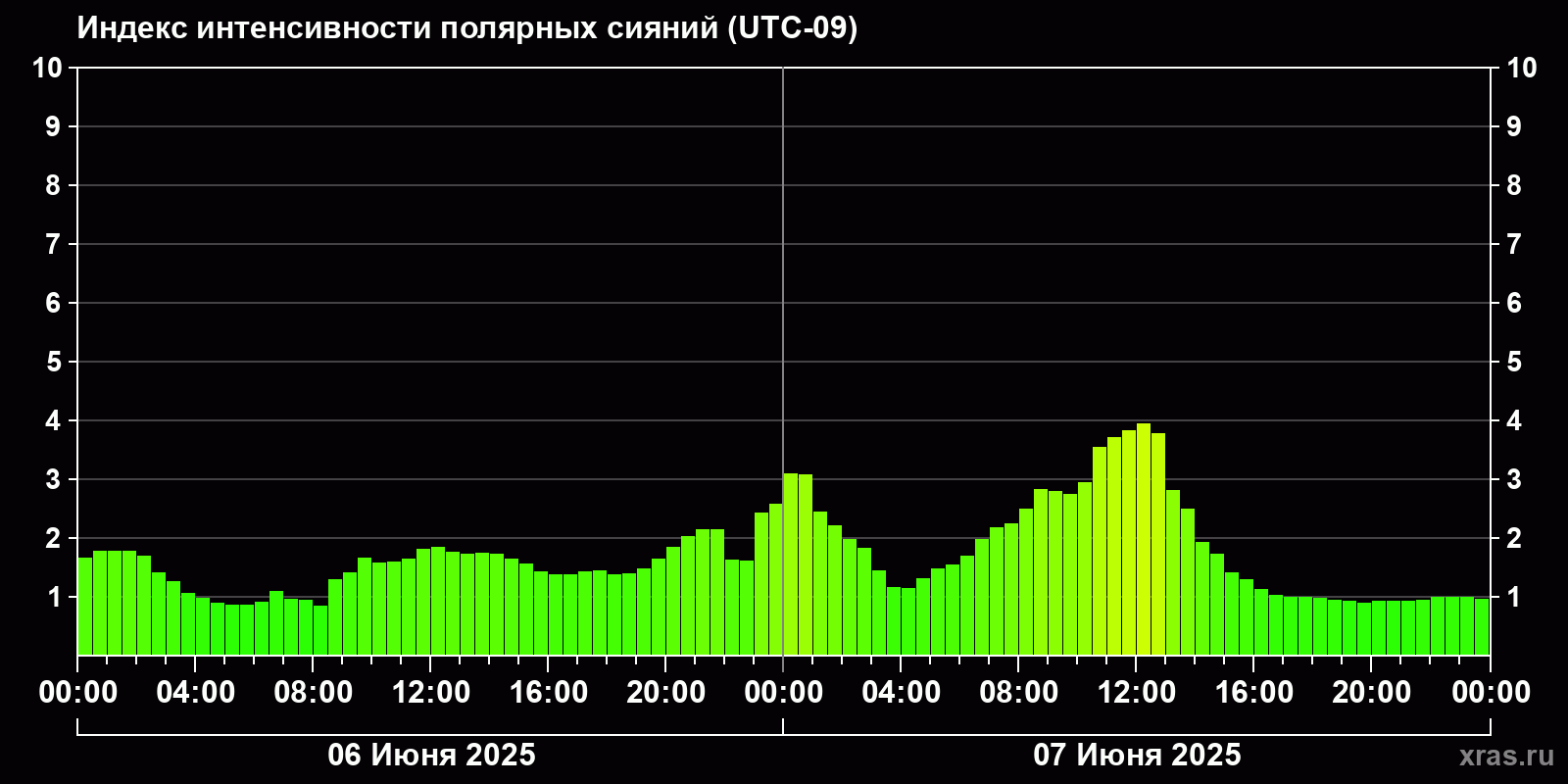 Изменения индекса интенсивности полярных сияний с 2025-06-06 по 2025-06-07 по местному времени