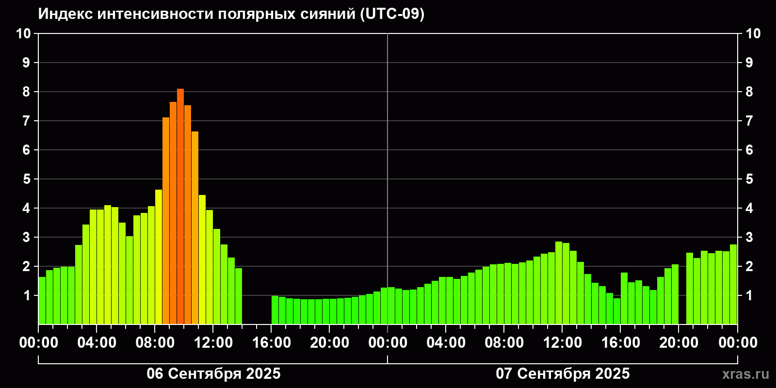 Изменения индекса интенсивности полярных сияний с 2025-09-06 по 2025-09-07 по местному времени