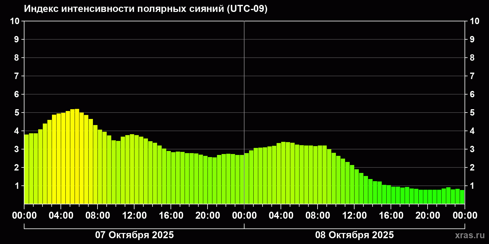 Изменения индекса интенсивности полярных сияний с 2025-10-07 по 2025-10-08 по местному времени