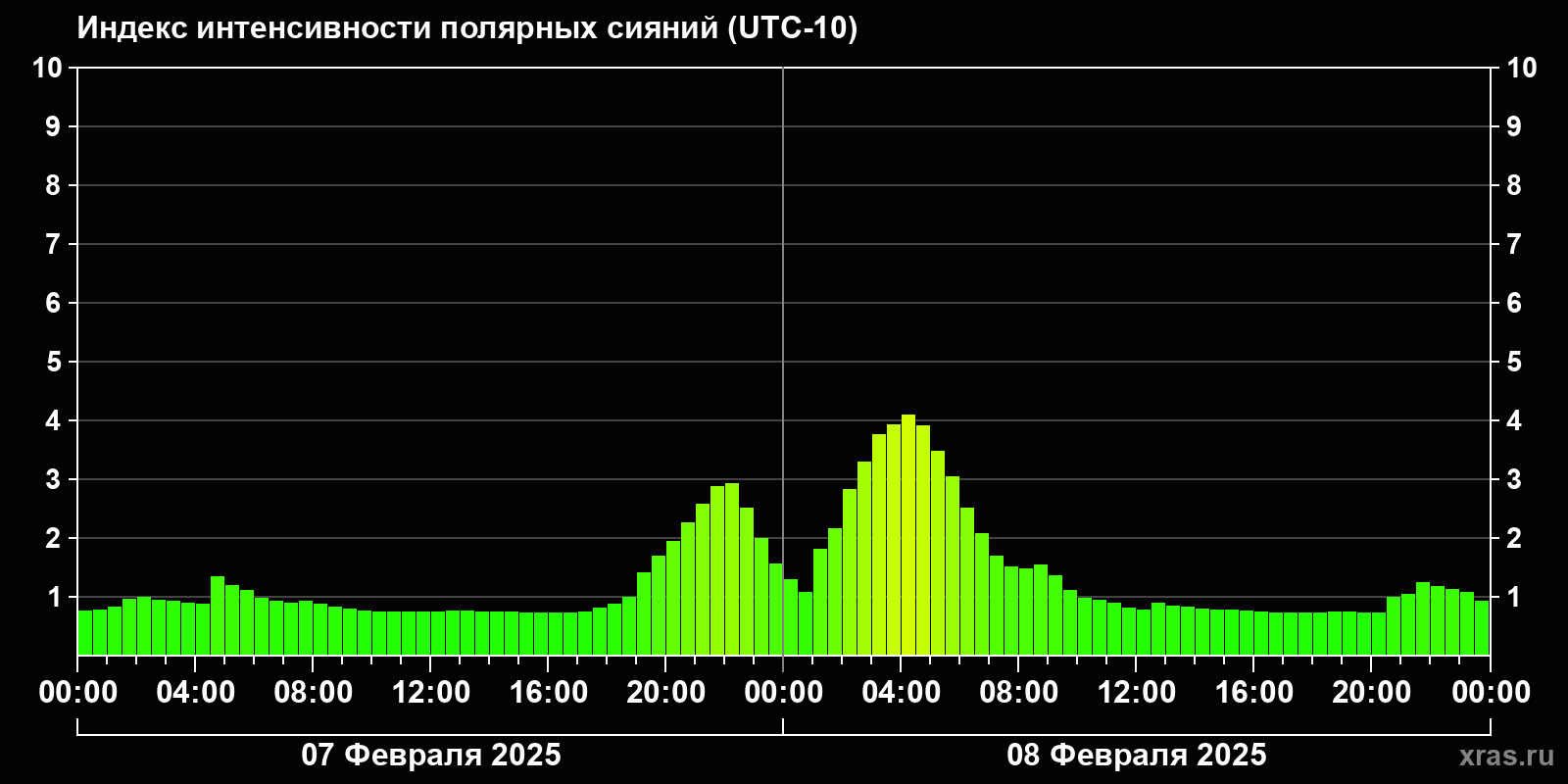 Изменения индекса интенсивности полярных сияний с 2025-02-07 по 2025-02-08 по местному времени