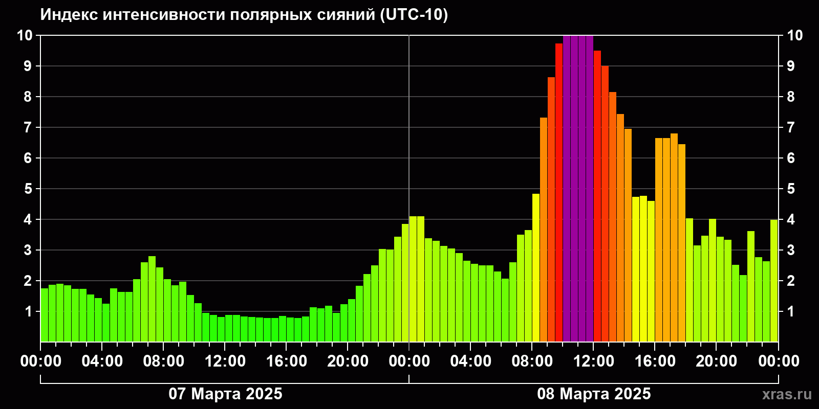 Изменения индекса интенсивности полярных сияний с 2025-03-07 по 2025-03-08 по местному времени